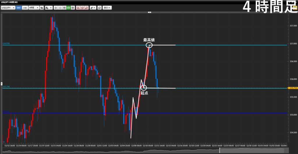 - 起点に引き付けて売りたいところだが、4時間足の上昇の起点が1時間足の値幅ど真ん中にあるので買いたい人と、売りたい人がいるため迷いが出やすいので1時間足の起点・終点のどちらかを抜けるまでは触らない方が無難。