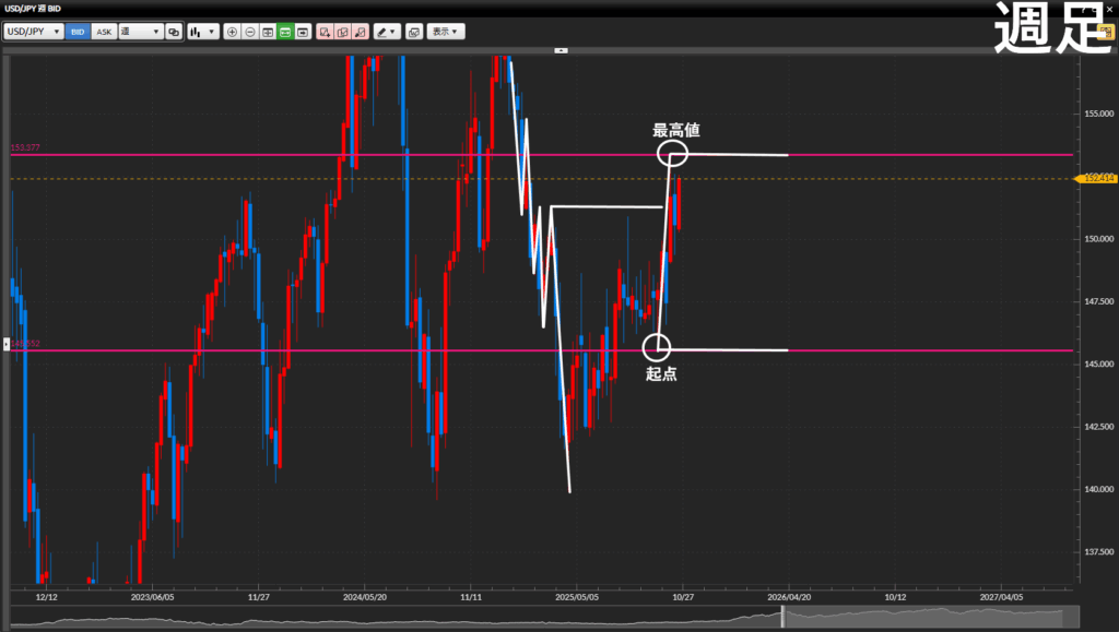 • 再度週足最高値の水準まで上がってきているここを上抜けしたら一旦長期的に見て155円台までいきそうですね。