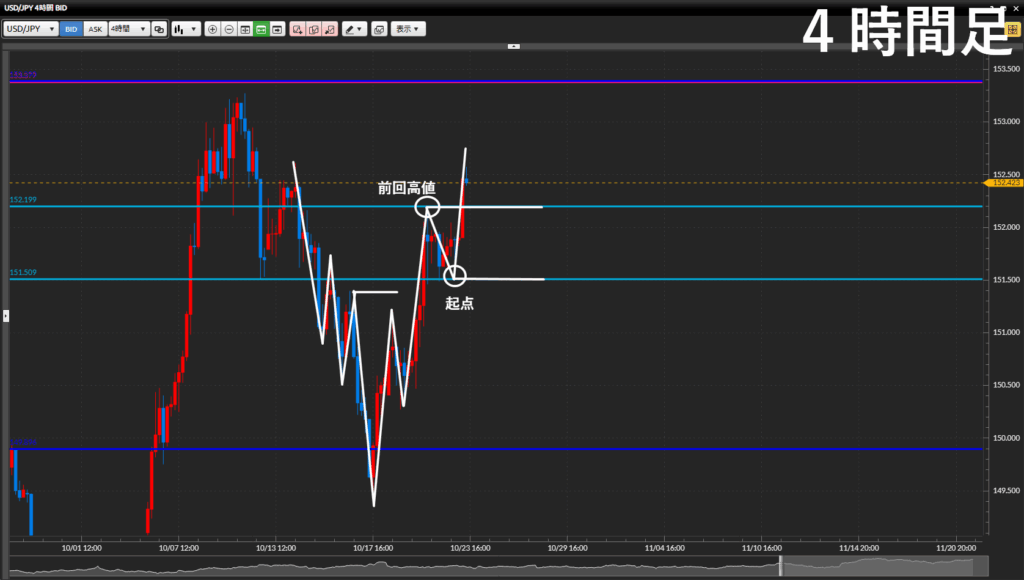 - 基本戦略:4時間足・1時間足前回高値水平線に引き付けて買い。そこでの5分足下降の波が崩れた瞬間に買いを入れていきたい。
