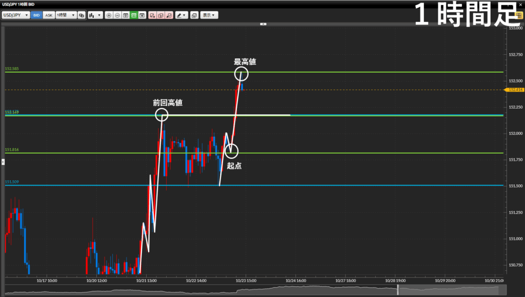 - 利確目標:1時間足最高値ちょい手前を目指したい。