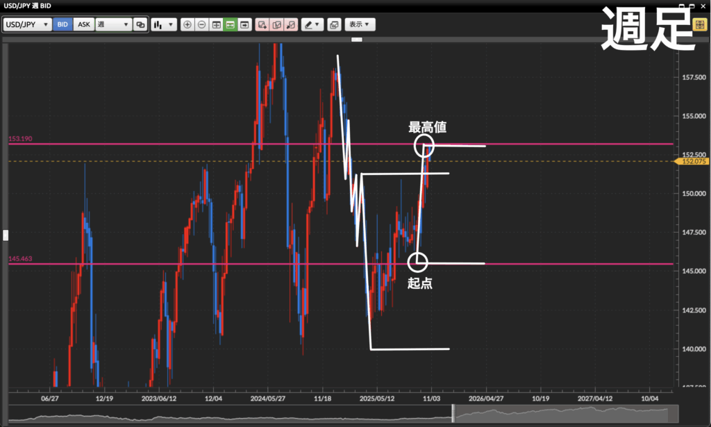 - 再度週足最高値の水準まで上がってきているここを上抜けしたら一旦長期的に見て155円台までいきそうですね。