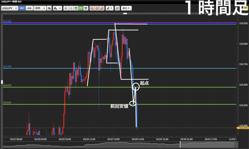 - 1時間足レベるで最安値ができたら前回安値くらいまで引き付けてショートを入れていきたい。