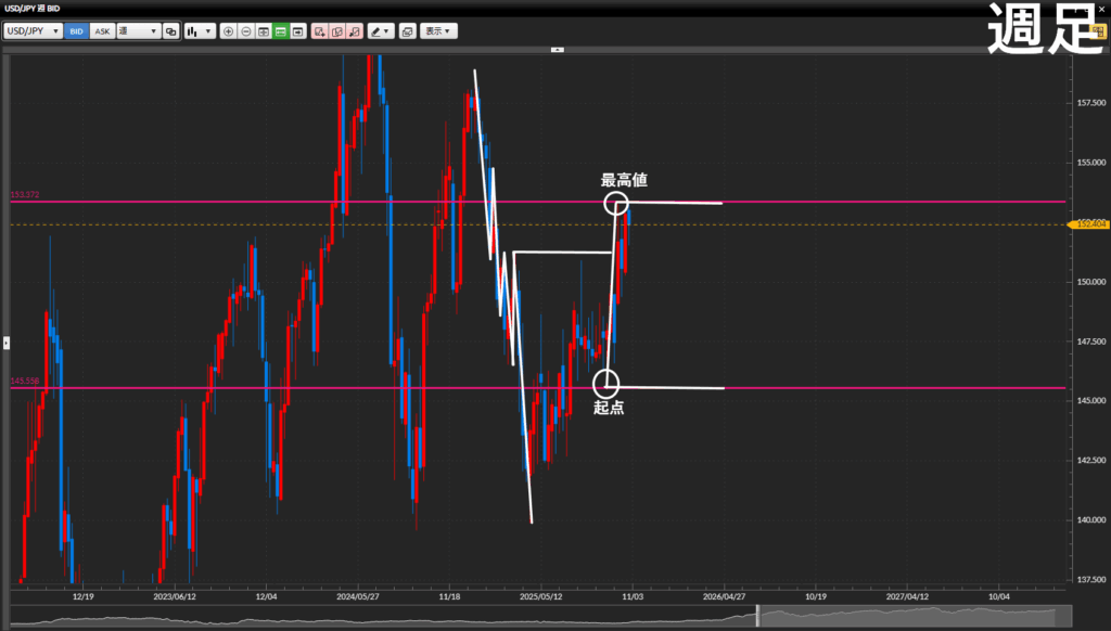 - 再度週足最高値の水準まで上がってきているここを上抜けしたら一旦長期的に見て155円台までいきそうですね。