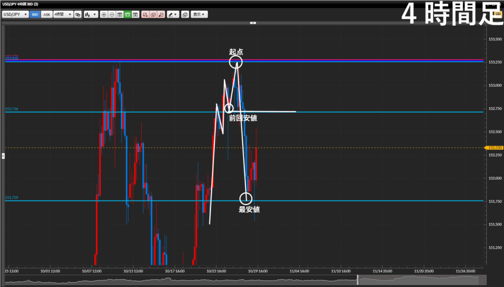 - 利確目標:4時間足最安値・1時間足起点水平線ちょい手前位までもっていきたい