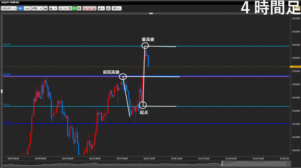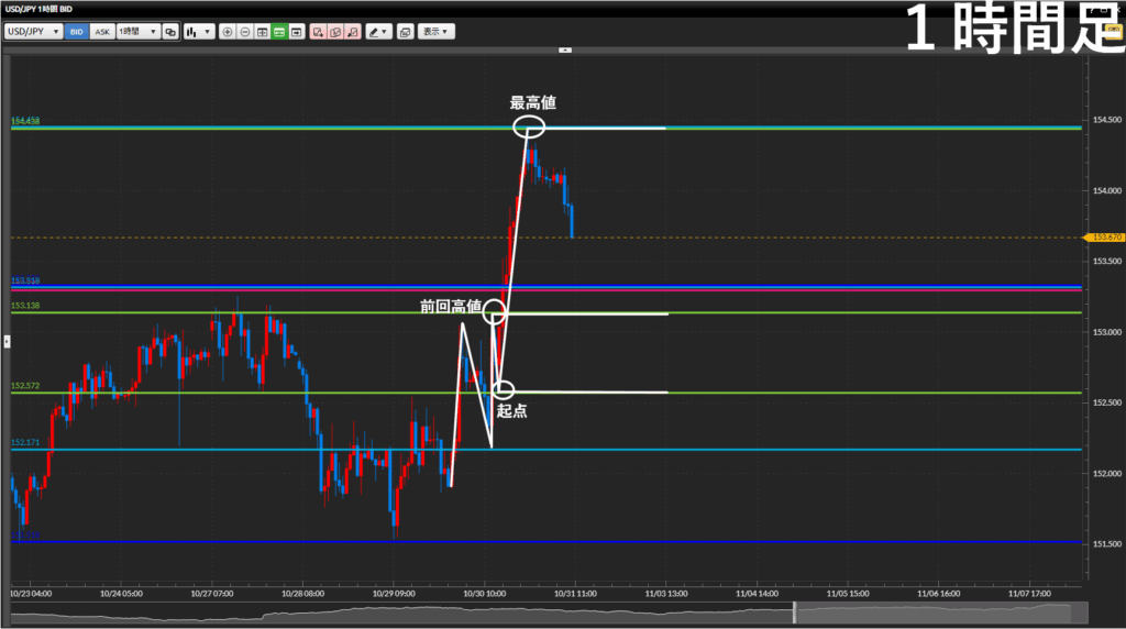 • 日足最高値を上に抜けて更新下位足に落として更にタイミングを見計らう