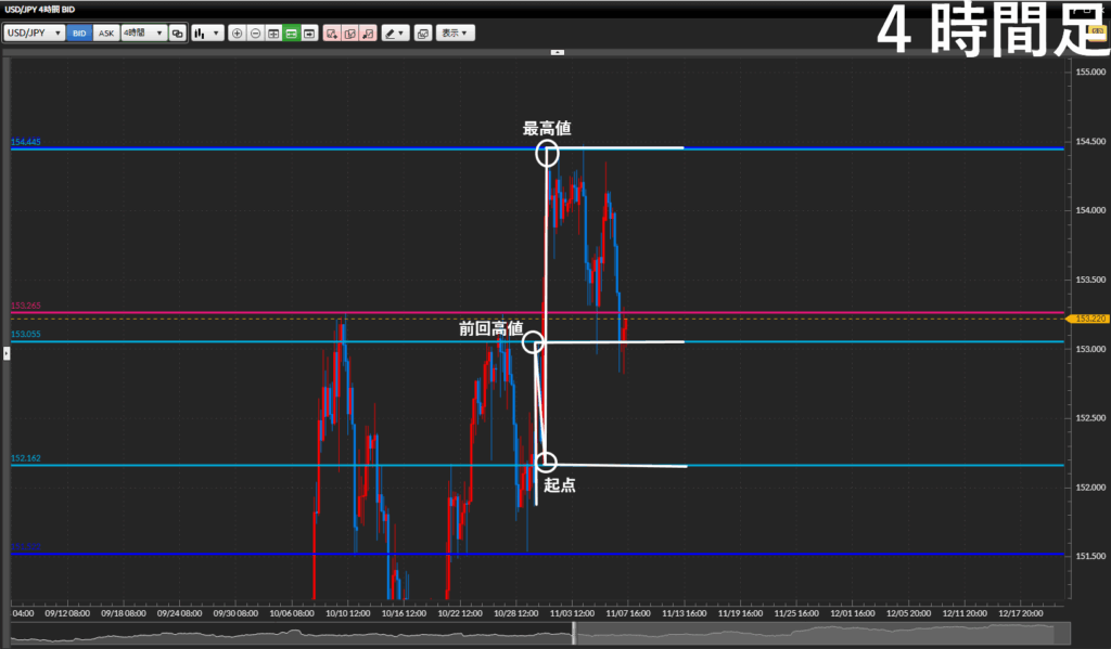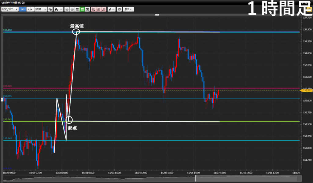 • 1時間足前回高値を下に割ったので起点・最高値の値幅でのトレード。