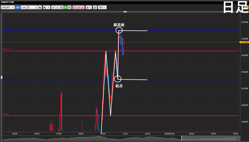 • 日足では前回高値をロウソク足実体で下に割ったので起点・終点の2本で見る。