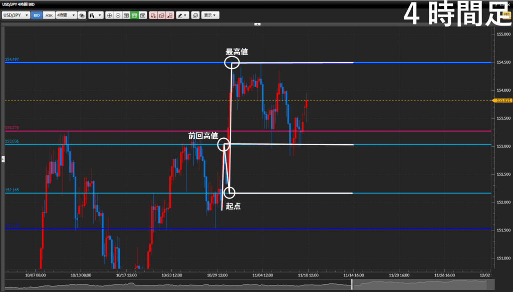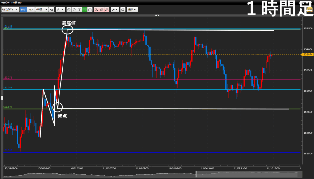 • 1時間足前回高値を下に割ったので起点・最高値の値幅でのトレード。