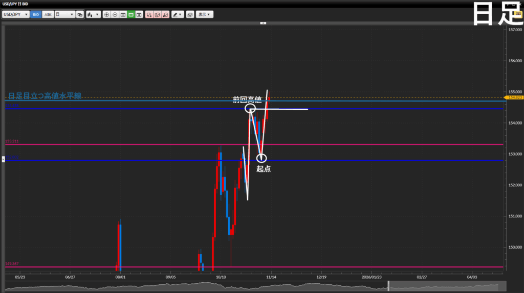 日足レベルのロウソク足で見ると(このらいんは日足の目立つ高値水平線です)