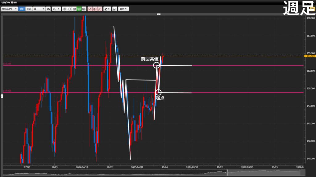 - 週足目立つ高値越えそうな感じがしますね!155円台上に行けばかなり上昇の勢いが強くなりそうです。。。