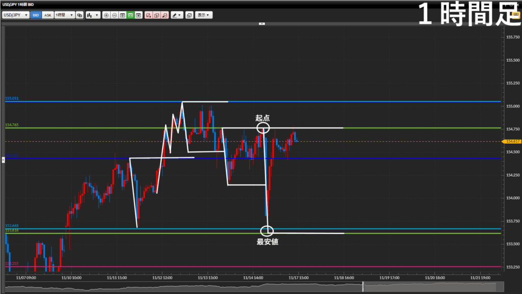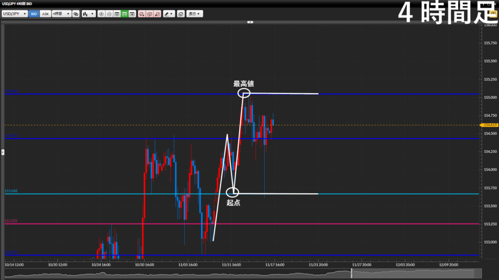 - 1時間足起点を上抜けしたら155円までサクッと狙っていける相場だと思う。