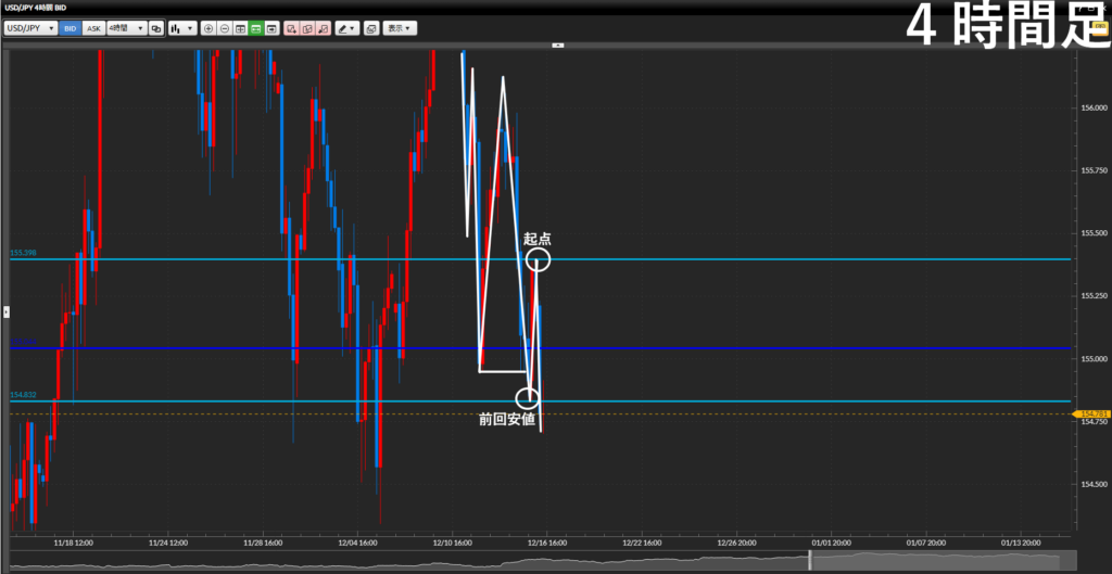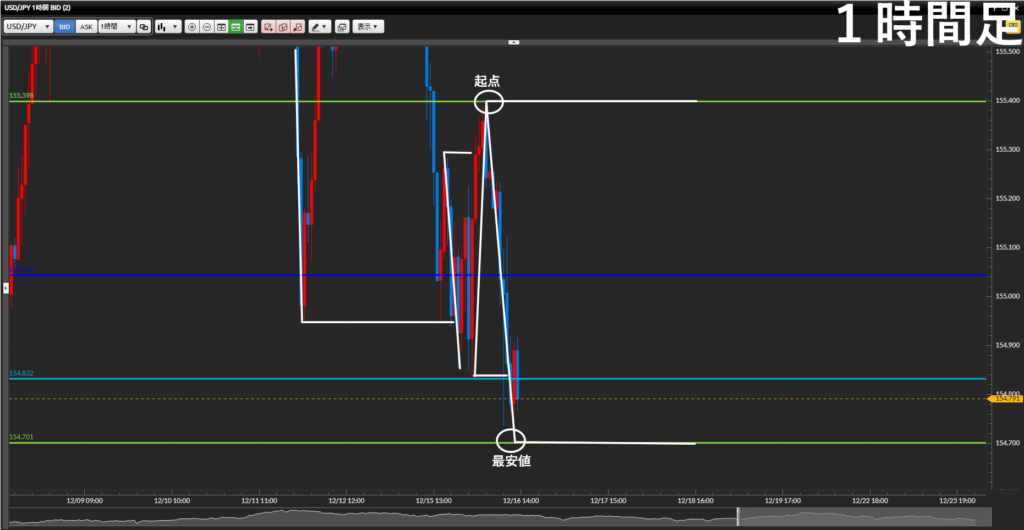 - この状態でロウソク足が確定すると、日足の起点水平線まで下落する可能性も高まるのでその波を4時間足・1時間足に落としてみていく。