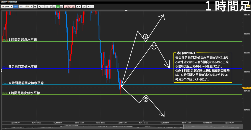 - 1時間足の値幅の真ん中に日足の水平線があるのでこの付近では振り回されやすい傾向にある