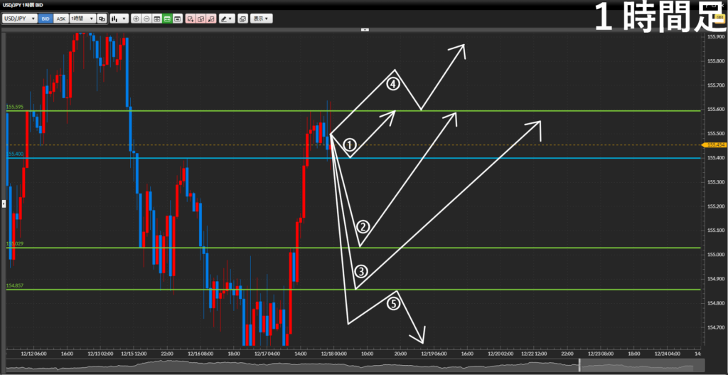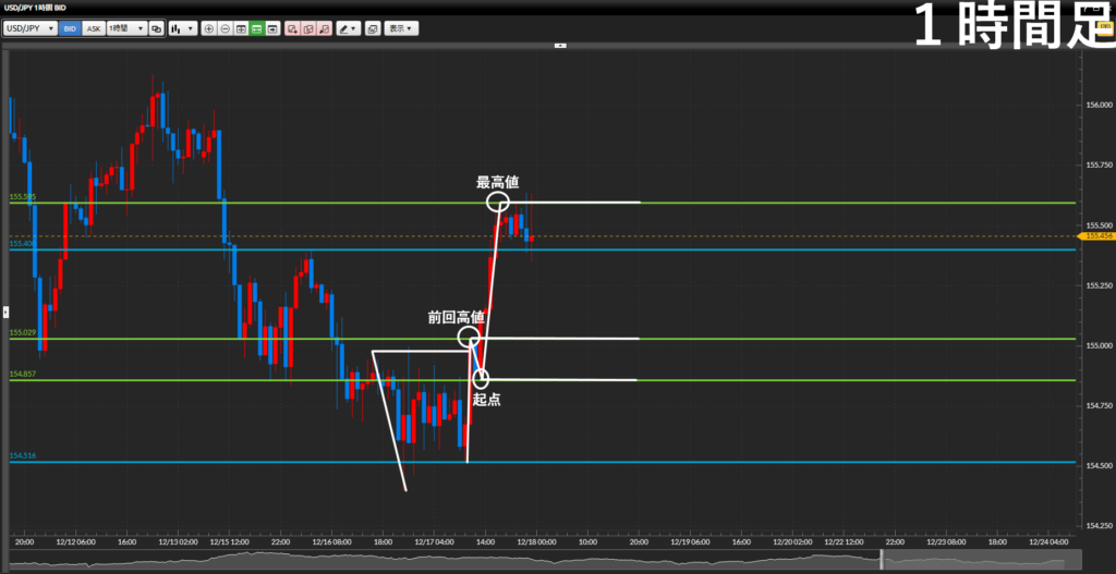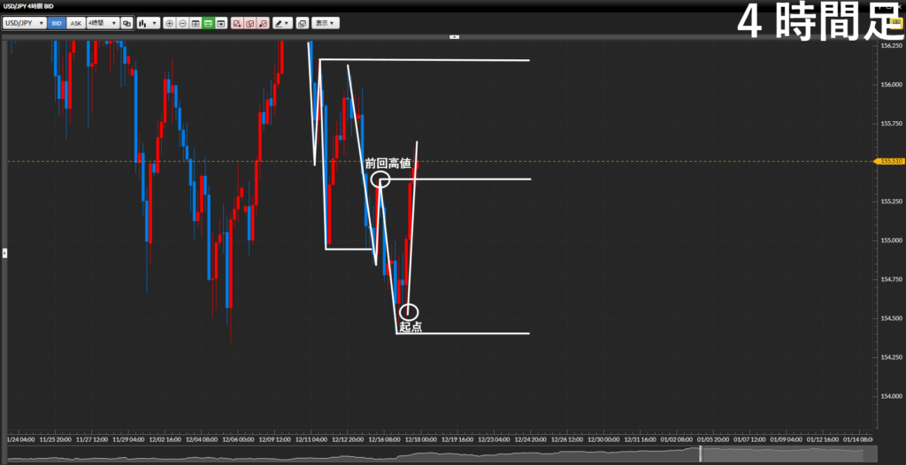 - 起点終点の値幅が広いので4時間足・1時間足に落として戦略を練っていく