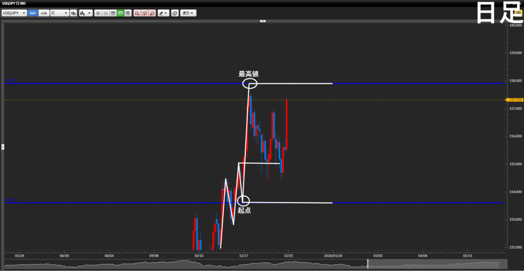 - 起点・終点の値幅で最高値付近まで上がってきている。