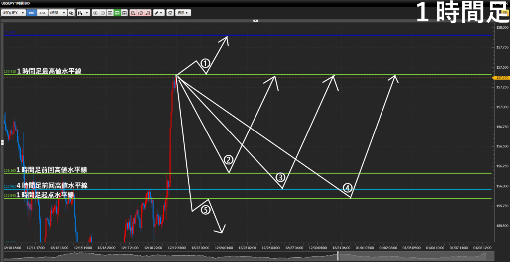 - 前回高値まで引き付けるにせよ距離があるので更に下の1時間足を見て戦略を立てる。