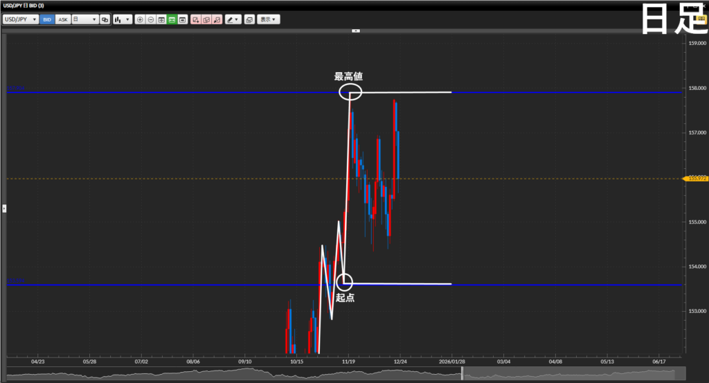 - 日足レベルでは起点・終点の値幅のど真ん中。