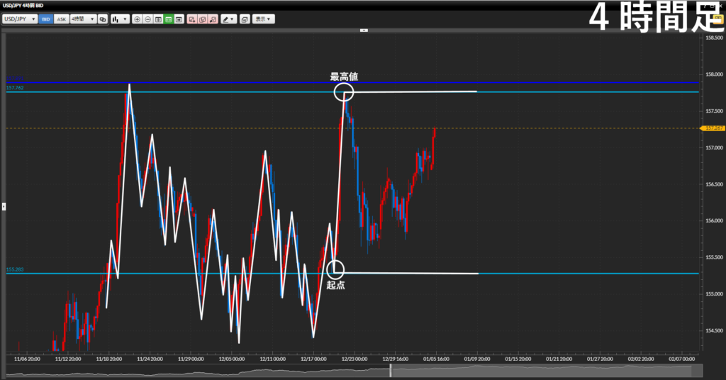 - 日足レベルではトレードしにくいので下位足に落としてみていく。