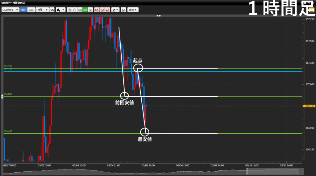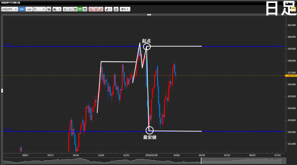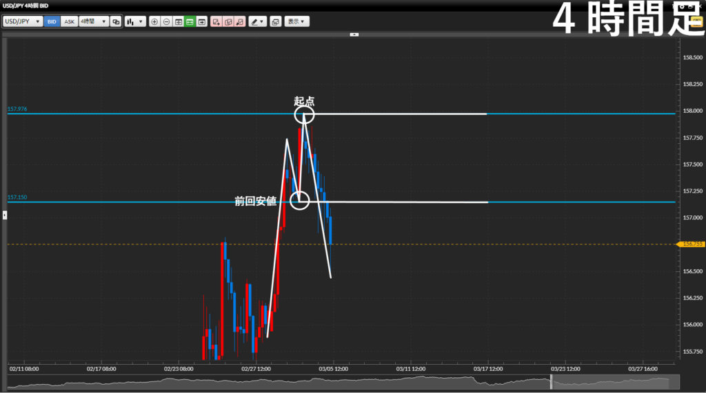- 最安値はまだ確定していないが前回の上昇の起点を下抜けたので下転換。