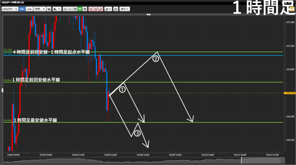 今回は【 日足 → 4時間足 → 1時間足】の順に、