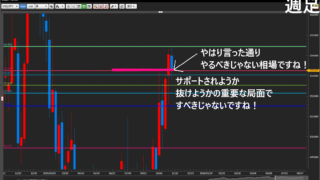 早くレンジ抜けろ!!!!と思うばかりです。(笑)抜けても焦って飛び乗りはNGですよ!飛び乗って損切りした後に思惑通りいくのがこのFXですから(笑)同じ戦略だ!!って思ったらコメントくださいね^^あ、ちなみに今の週足前回高値にひいてあるピンク...